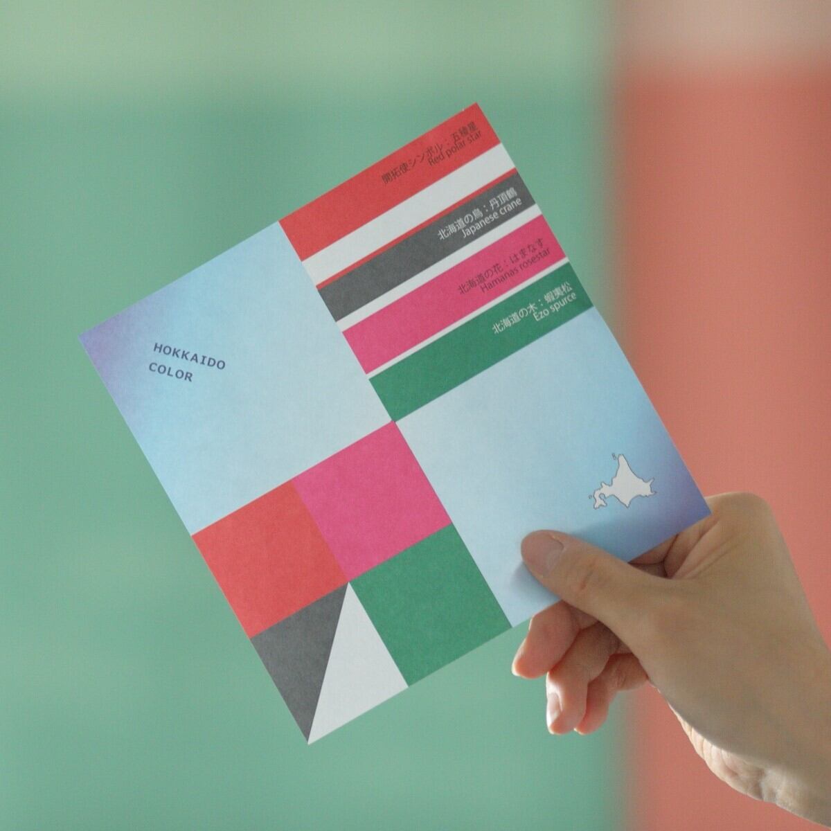 北海道開拓使シンボル「五稜星レッド」、北海道の花「はまなすピンク」、北海道の木「蝦夷グリーン」、北海道の鳥「丹頂の赤、白黒」。